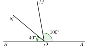 Cho góc bẹt \(AOB\). Trên cùng một nửa mặt phẳng bờ \(AB\) vẽ các tia \(OM\) và \(ON\) sao cho \(\angle AOM = {100^0},\,\,\angle BON = {40^0}.\) Chứng tỏ rằng tia \(ON\) là tia phân giác của \(\angle BOM.\)