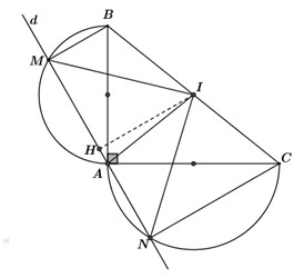 Cho tam giác ABC vuông tại A. Vẽ các nửa đường tròn đường kính AB và AC sao cho các nửa đường tròn này không có điểm nào nằm trong tam giác ABC. Đường thẳng \(d\) đi qua A cắt các nửa dường tròn đường kính AB và AC theo thứ tự ở M và N (khác điểm A). Gọi I là trung điểm của đoạn thẳng BC.