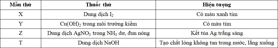 Kết quả thí nghiệm của các dung dịch X, Y, Z, T với thuốc thử được ghi ở bảng sau: