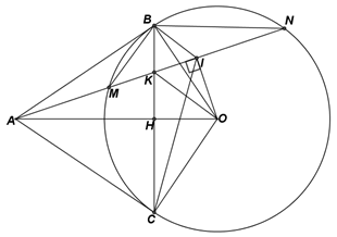 Cho đường tròn \(\left( O \right)\) và điểm \(A\) nằm ngoài đường tròn. Kẻ các tiếp tuyến \(AB,\,\,\,AC\) với đường tròn (\(B,C\) là các tiếp điểm). Gọi \(H\) là giao điểm của \(AO\) và \(BC\), \(K\) là trung điểm của \(HB\). Đường thẳng \(AK\)cắt đường tròn tại \(M\) và \(N\) (\(M\) nằm giữa \(A\) và \(N\)). Kẻ \(OI\) vuông góc với \(MN\) (\(I\)thuộc \(MN\)). Chứng minh: