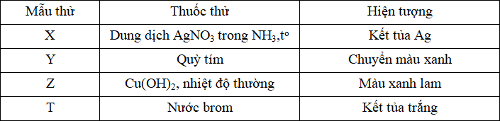 Kết quả thí nghiệm của các dung dịch X, Y, Z, T với các thuốc thử được ghi ở bảng