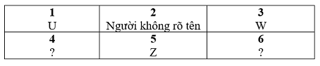 Nếu hàng trên, từ trái qua lần lượt là: U, người không rõ tên, W thì điều nào sau đây phải đúng?