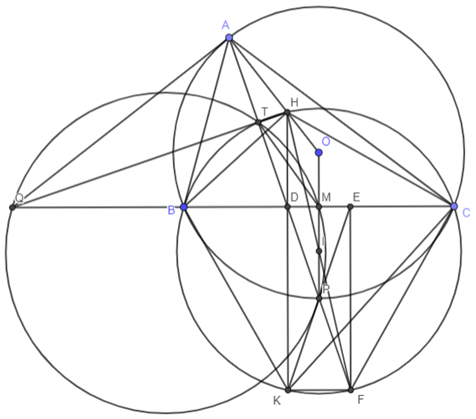 Cho tam giác \(ABC\) nội tiếp đường tròn \(\left( O \right)\left( {AB < AC} \right),\) điểm \(M\) là trung điểm của cạnh \(BC.\) Đường phân giác trong của \(\angle BAC\) cắt BC tại D và cắt đường tròn\(\left( O \right)\) tại điểm \(P\,\,\,\left( {P \ne A} \right).\) Gọi \(E\) là điểm đối xứng với \(D\) qua \(M.\) Qua \(D\) kẻ đường thẳng vuông góc với \(BC\) cắt đường thẳng \(AO\) tại \(H.\) Qua \(E\) kẻ đường thẳng vuông góc với \(BC\) cắt đường thẳng \(AD\) tại \(F.\) Gọi \(K\) là giao điểm của \(PE\) và \(DH.\)