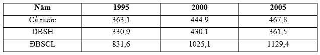 Biểu đồ thích hợp nhất thể hiện sản lượng lương thực có hạt bình quân đầu người của cả nước và hai vùng đồng bằng nước ta giai đoạn 1995 – 2005 là