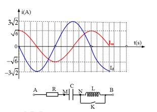 Cho mạch điện như hình vẽ, cuộn dây thuần cảm. Đặt vào hai đầu đoạn mạch điện áp xoay chiều có biểu thức \(u = 100\sqrt 6 \cos (100\pi t + \varphi )(V)\). Khi K mở hoặc đóng, thì đồ thị cường độ dòng điện qua mạch theo thời gian tương ứng là im và id được biểu diễn như hình bên. Điện trở các dây nối rất nhỏ. Giá trị của R bằng:
