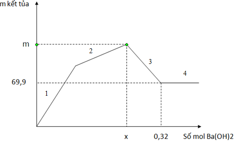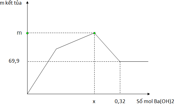 Nhỏ từ từ dung dịch Ba(OH)2 đến dư vào dung dịch hỗn hợp Na2SO4 và Al2(SO4)3 ta có đồ thị biểu diễn sự phụ thuộc khối lượng kết tủa theo số mol Ba(OH)2 như sau