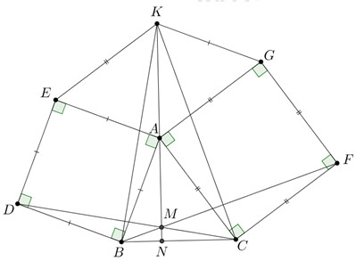 Cho tam giác nhọn \(ABC\). Dựng bên ngoài tam giác \(ABC\) các hình vuông \(ABDE,\) \(ACFG\) và hình bình hành \(AEKG.\)
