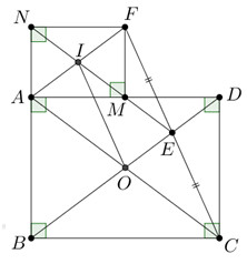 Cho hình chữ nhật \(ABCD.\,\,E\) là một điểm tùy ý trên đường chéo \(BD.\) Gọi \(F\) là điểm đối xứng của \(C\) qua \(E.\) \(M,\,\,N\) theo thứ tự là hình chiếu của \(F\) trên \(AD\) và \(AB.\) Chứng minh rằng \(E,\,\,M,\,\,N\) thẳng hàng.