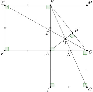 Cho tam giác \(ABC\) vuông tại \(A,\) đường cao \(AH.\) Trên các cạnh \(AB,AC\) thứ tự dựng các hình vuông \(ABEF,\,\,ACGI\) nằm ngoài tam giác \(ABC.\) Gọi \(O\) là giao điểm của \(BG\) và \(AH.\) Chứng minh rằng \(C,O,E\) thẳng hàng.