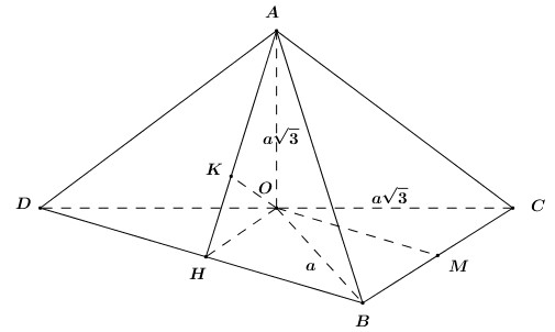 Tứ diện OABC. OA, OB, OC đôi một vuông góc. \(OA = OC = a\sqrt 3 ,\,\,OB = a\). M là trung điểm BC. Tính \(d\left( {OM;AB} \right)\).