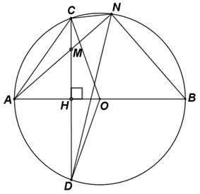 Cho đường tròn \(\left( O \right)\), đường kính \(AB\). Dây \(CD\) vuông góc với \(AB\) tại \(H\). \(M\)là một điểm trên đoạn thẳng \(CD\), tia \(AM\) cắt \(\left( O \right)\) tại \(N\).