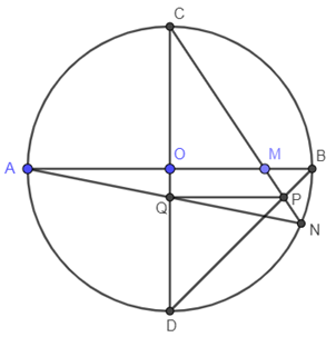 Cho đường tròn \(\left( {O;R} \right)\) có hai đường kính \(AB\) và \(CD\) vuông góc với nhau. Gọi \(M\) là điểm di động trên đoạn thẳng \(OB\,\,\left( {M \ne O,\,\,M \ne B} \right).\) Tia \(CM\) cắt đường tròn \(\left( O \right)\) tại \(N;\,\,BD\) cắt \(CN\) tại \(P;\,\,AN\) cắt \(CD\) tại \(Q.\)