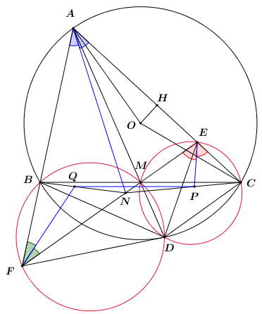 Cho tam giác nhọn \(ABC\) nội tiếp đường tròn \(\left( O \right)\) với \(AB < AC.\) Gọi \(M\) là trung điểm của \(BC,\,\,AM\) cắt \(\left( O \right)\) tại điểm \(D\) khác \(A.\) Đường tròn ngoại tiếp tam giác \(MDC\) cắt đường thẳng \(AC\) tại \(E\) khác \(C.\) Đường tròn ngoại tiếp tam giác \(MDB\) cắt đường thẳng \(AB\) tại \(F\) khác \(B.\)