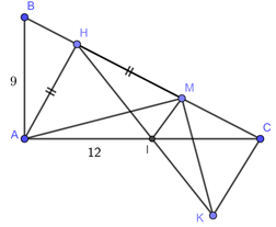 c) Trên cạnh \(HC\) lấy điểm \(M\) sao cho \(HM = HA.\) Qua \(M\) vẽ đường thẳng vuông góc với cạnh \(BC\) cắt \(AC\) tại \(I.\) Qua \(C\) vẽ đường thẳng vuông góc với cạnh \(BC\) cắt tia phân giác của \(\angle IMC\) tại \(K.\) Chứng minh ba điểm \(H,\,\,I,\,\,K\) thẳng hàng.