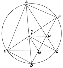 Cho đường tròn \(\left( {O;R} \right)\) và dây cung \(BC\) cố định, \(A\) là điểm di động trên cung \(BC\) sao cho tam giác \(ABC\)nhọn. Hai đường phân giác trong của góc \(A\) và \(B\) cắt nhau ở \(I\)và thứ tự cắt đường tròn ở \(D,E\). Đường thẳng \(DE\) cắt \(BC,AC\) ở \(M,N\).