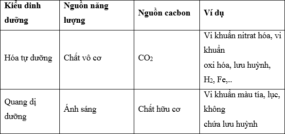 Hãy nêu sự khác biệt giữa vi sinh vật hóa tự dưỡng và vi sinh vật quang dị dưỡng về nguồn