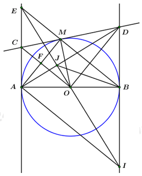 b) Đường thẳng \(EO\) cắt hai đường thẳng \(d',AD\) lần lượt tại \(I\) và \(J.\) Chứng minh các điểm \(A,B,I,J\) cùng thuộc một đường tròn.