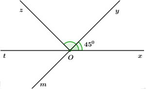 Trên cùng một nửa mặt phẳng bờ chứa tia \(Ox\), vẽ hai tia \(Oy\) và \(Oz\) sao cho \(\angle xOy = {45^0},\,\,\angle xOz = {135^0}.\) Vẽ tia \(Ot\) là tia đối của tia \(Ox\).