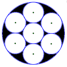 - Tính diện tích phần tô đen trong hình ta lấy diện tích hình tròn lớn trừ đi diện tích của \(7\) hình tròn nhỏ.
