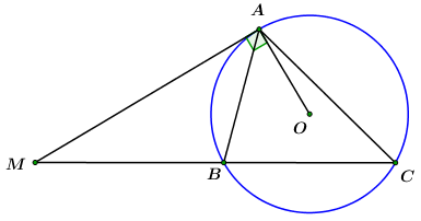 Cho \(\Delta ABC\) nội tiếp đường tròn \(\left( O \right).\) Tiếp tuyến tại \(A\) của \(\left( O \right)\) cắt đường thẳng \(BC\) ở \(M.\) Chứng minh rằng: \(\frac{{MB}}{{MC}} = \frac{{A{B^2}}}{{A{C^2}}}\).