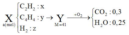 Nung nóng a mol hỗn hợp gồm: axetilen, vinylaxetilen và hiđro (với xúc tác Ni, giả thiết chỉ xảy ra phản ứng cộng H2), thu được hỗn hợp Y có tỉ khối so với H2 là 20,5. Đốt cháy hoàn toàn Y, thu được 0,3 mol CO2 và 0,25 mol H2O. Biết các phản ứng xảy ra hoàn toàn. Giá trị của a là