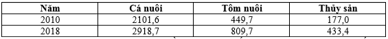 Cho bảng số liệu: SẢN LƯỢNG THỦY SẢN NUÔI TRỒNG CỦA NƯỚC TA NĂM 2010 VÀ 2018 (Đơn vị: