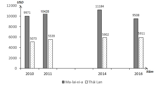 Cho biểu đồ: GDP/NGƯỜI CỦA MA-LAI-XI-A VÀ THÁI LAN, GIAI ĐOẠN 2010 - 2016 (Nguồn số liệu theo