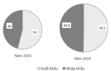 Cho biểu đồ về xuất nhập khẩu của nước ta năm 2010 và 2016: