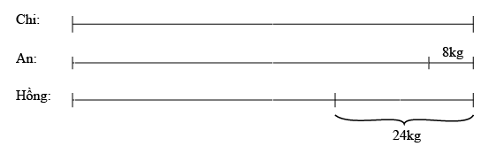Tìm số cân nặng của Chi hơn An, sau đó tìm số cân nặng của Chi hơn Hồng, rồi ta vẽ sơ đồ biểu thị số cân nặng của 3 bạn theo số cân nặng của Chi. Dựa vào sơ đồ tìm số cân nặng của Chi.