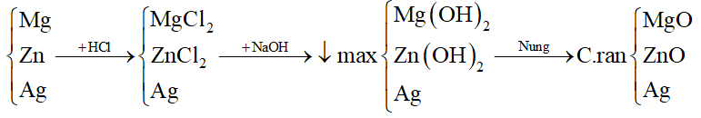 Cho 20,4 g hỗn hợp Mg, Zn, Ag vào cốc đựng 600 ml dung dịch HCl 1M (vừa đủ). Sau khi phản ứng kết thúc, thêm dần NaOH vào để đạt được kết tủa tối đa. Lọc kết tủa và nung nóng ở nhiệt độ cao đến khối lượng không đổi được a gam chất rắn. Giá trị của a là