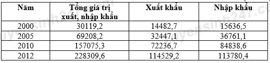 Cho bảng số liệu sau: TÌNH HÌNH XUẤT, NHẬP KHẨU CỦA NƯỚC TA GIAI ĐOẠN 2000-2012 ( Đơn vị: