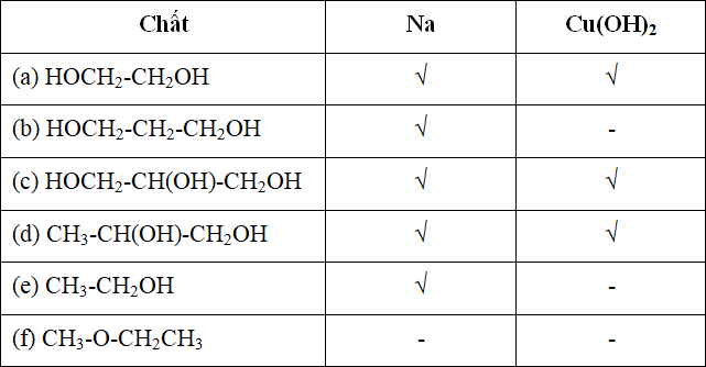 Cho các hợp chất sau: (a) HOCH2-CH2OH; (b) HOCH2-CH2-CH2OH; (c) HOCH2-CH(OH)-CH2OH; (d) CH3-CH(OH)-CH2OH; (e)