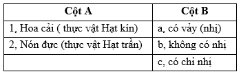 Nối cơ quan sinh sản của loại thực vật ở cột A với đặc điểm cấu tạo đặc trưng của nhị tương ứng ở cột B cho phù hợp:
