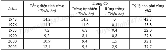 Cho bảng số liệu: BIẾN ĐỔI DIỆN TÍCH RỪNG VÀ ĐỘ CHE PHỦ RỪNG NƯỚC TA GIAI ĐOẠN