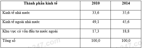 Cho bảng số liệu: CƠ CẤU TỔNG SẢN PHẢM TRONG NƯỚC (GDP) PHÂN THEO THÀNH PHẦN KINH TẾ CỦA