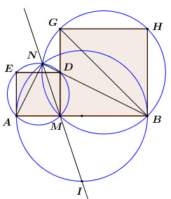 Cho đoạn AB cố định, M di động trên AB. Trên 1 nửa mặt phẳng bờ AB vẽ 2 hình vuông AMDE và MBHG, hai đường tròn ngoại tiếp hai hình vuông cắt nhau tại N. Chứng minh MN luôn đi qua điểm cố định khi M di chuyển trên AB.
