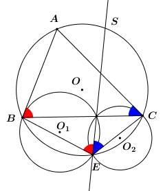 - Gọi S là giao điểm của DE với đường tròn (O) ngoại tiếp tam giác ABC.