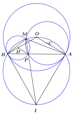 Cho đường tròn (O; R) và dây cung \(AB = R\sqrt 3 \). Điểm P thuộc AB (P khác A và B). Gọi \(\left( {C;{R_1}} \right)\) là đường tròn đi qua P và tiếp xúc với đường tròn (O; R) tại A. Gọi \(\left( {D;{R_2}} \right)\) là đường tròn đi qua P và tiếp xúc với đường tròn (O; R) tại B. Các đường tròn \(\left( {C;{R_1}} \right)\) và \(\left( {D;{R_2}} \right)\) cắt nhau tại M khác P. Chứng minh rằng khi P di động trên AB thì PM luôn đi qua 1 điểm cố định.