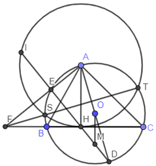 b) Gọi \(S,T\) là các giao điểm của đường tròn \(\left( O \right)\) với đường tròn tâm \(A,\) bán kính \(AH;\,\,F\) là giao điểm của \(ST\) và \(BC.\) Từ \(A\) kẻ đường thẳng vuông góc với \(DH\) tại \(E.\) Chứng minh \(FB.FC = F{H^2}\)và 3 điểm \(F,E,A\) thẳng hàng.