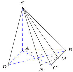 Cho hình chóp S.ABCD có đáy ABCD là hình vuông, SA vuông góc với đáy. Gọi M là trung điểm BC, N là