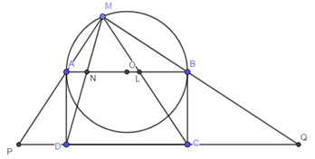 Cho hình chữ nhật ABCD có \(AB = 2a,BC = a\sqrt 2 \). Lấy đoạn AB làm đường kính, dựng về phía ngoài hình chữ nhật nửa đường tròn. Điểm M thuộc nửa đường tròn đó. Các đường thẳng MD, MC cắt AB lần lượt tại N, L. Chứng minh \(\frac{{A{L^2} + B{N^2}}}{{A{B^2}}} = 1\).