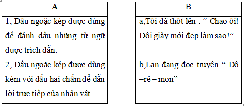 Em hãy nối tác dụng của dấu ngoặc kép ở cột A với những ví dụ ở cột B cho phù hợp: