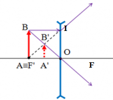 Một thấu kính phân kì có tiêu cự \(f=20cm\). Một vật thật AB cách thấu kính 20cm. Ảnh thu được là