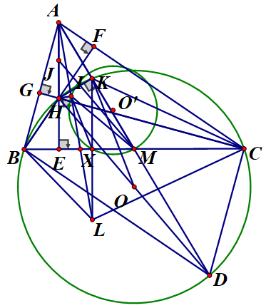 Cho tam giác nhọn \(ABC\) không cân có \(AB < AC,\) trực tâm \(H\) và đường trung tuyến \(AM.\)Gọi K là hình chiếu vuông góc của \(H\) lên \(AM,\)D là điểm đối xứng của A qua M và L là điểm đối xứng của K qua BC