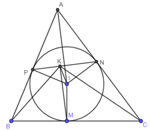 Đường tròn nội tiếp tam giác \(ABC\) tiếp xúc với các cạnh \(BC,CA,AB\) lần lượt tại \(M,N,P\). Gọi \(K\) là hình chiếu vuông góc của \(M\) lên \(NP.\)