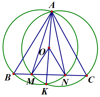 Cho tam giác đều ABC. Gọi M, N là hai điểm nằm trên cạnh BC sao cho \(\angle MAN = {30^0}\) (M nằm giữa B và N). Gọi K là giao điểm của hai đường tròn \(\left( {ABN} \right)\) và \(\left( {ACM} \right)\). Chứng minh rằng: