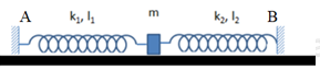 Hai lò xo \({L_1},{L_2}\) có chiều dài tự nhiên là \({l_{01}} = 90\,\,cm\) và \({l_{02}} = 100\,\,cm\), độ cứng \({k_1} = 100\,\,N/m\) và độ cứng \({k_2} = 150\,\,N/m\) móc với vật \(m = 100\,\,g\) có kích thước không đáng kể vào hai điểm cố định A, B cách nhau \(200\,\,cm\) như hình vẽ. Chọn gốc O trùng với VTCB, chiều dương từ A đến B. Kích thích dao động bằng cách kéo vật tới vị trí để lò xo \({L_1}\) không biến dạng rồi truyền cho vật vận tốc \(v = 3\sqrt 3 \,\,m/s\) theo chiều từ B đến A. Chọn lúc đó làm gốc thời gian. Phương trình dao động của vật là