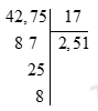 Số dư của phép chia \(42,75:17\) (thương lấy 2 chữ số ở phần thập phân) là: