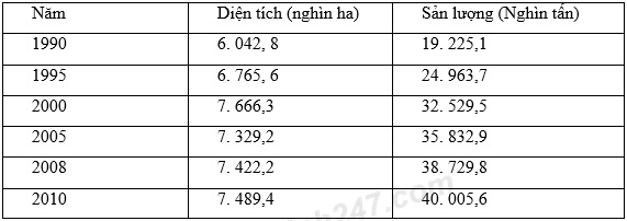 Cho bảng số liệu sau DIỆN TÍCH VÀ SẢN LƯỢNG LÚA Ở NƯỚC TA, GIAI ĐOẠN 1990 – 2010 Kiểu