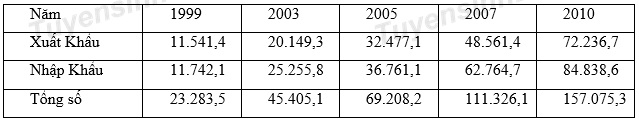 Cho bảng số liệu sau: GIÁ TRỊ XUẤT NHẬP KHẨU CỦA VIỆT NAM GIAI ĐOẠN 1999 - 2010 (Đơn vị: